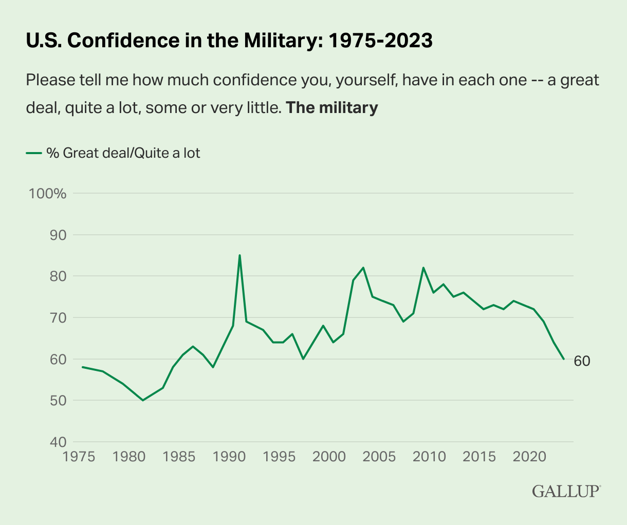 America faces a crisis of confidence in its military. The Army has not hit its recruiting goal in three years. The Navy missed its goal last year and will likely only make this year’s goal by significantly reducing academic standards. Public confidence in the military’s fidelity to the Constitution is also falling. A recent palnning exercise speculated that, if called to put down an insurrection by Trump supporters after a loss later this year, a significant portion of the military would not respond. Public support for the military has fallen from 75% to 60% since 2018. The next President should refocus on the military participation as serving as part of a team, reverse rising disability rates, and realign defense priorities to match our real world challenges.